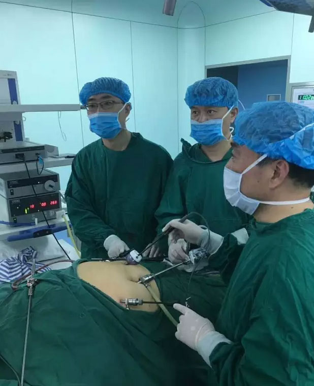接诊后,江永强院长高度重视,提请医务处胡伟科长,组织全院疑难肿瘤病人多学科团队(MDT)会诊讨论。多位专家一致认为手术指征明确,但手术难度极高,麻醉管理难度较大,围手术期风险及并发症发生率高。尤其采用腹腔镜微创的方法,更是奇思妙想,大胆创新的思维。普外一科肝胆胰病区徐友标、张军、顾冕三位专家在术前翻阅了大量国内外关于“镜面人”手术的文字和录像资料,积极准备术中突发状况预案,并模拟进行演习。一切充分准备就绪后,手术于8月17日上午进行,徐友标主任亲自主刀,张军、顾冕两位医师配合,麻醉科刘伦主任主麻。术中在病人腹部五处布孔(每个孔约0.5-1cm)。徐主任采用反向操作及反手游离,经过三个小时紧张细致的操作,成功为病人实施“腹腔镜下肝脏IV、VII段两处肿瘤切除+胆囊切除术”。术中失血极少,麻醉平稳,病人在SICU(外科重症监护室)过渡一天后,即转回肝胆胰病房。次日刘阿姨已经进流质饮食,并可以适当活动,微创手术带给她的术后疼痛感觉微乎其微,刘阿姨和子女都难以相信,经历了如此高难度的大手术。