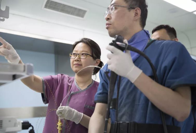 孙敏参与的ERCP手术,可谓来头不小!这项手术又称“经内镜逆行性胰胆管造影术”,通俗地说,是指将十二指肠镜插至十二指肠降部,找到十二指肠乳头,由活检管道内插入造影导管至乳头开口部,注入造影剂后x线摄片,以显示胰胆管的技术。由于ERCP不用开刀,创伤小,手术时间短,并发症较传统手术少,住院时间也大大缩短,深受患者欢迎。在短短几十年中ERCP在临床上取得了巨大的成绩,已经成为当今胰胆疾病重要的治疗手段。由于手术对技术和器械要求都较高,既是内镜相关造影手术的前沿阵地,又是东方总院医护精英们的“家常便饭”。“作为手术台上的一助,决定着我要与主刀医生密切配合,应对复杂情况和随时变化,成功完成手术,这就决定了我必须以最谨慎的态度、最精细的把控去应对一场场战役,我自身的状态将影响到整个手术的进程与效果,不容一丝懈怠。因此,我每天都扪心自问:是否做到了最好!”孙敏总是这样说。