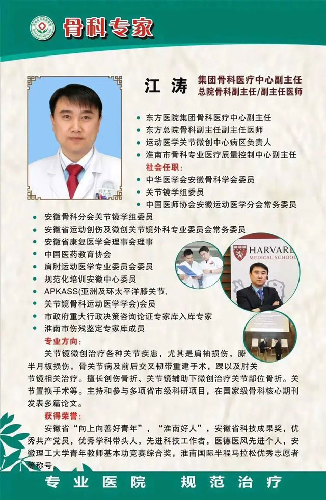 江涛,副主任医师,淮南东方医院集团骨科医疗中心副主任、中华医学会安徽骨科学会委员、安徽骨科分会关节镜学组委员、安徽省运动创伤及微创关节镜外科专业委员会常务委员。专业开展关节镜微创治疗各类关节疾患,尤其是肩袖损伤,膝半月板损伤,骨关节病及前后交叉韧带重建手术,踝以及肘关节镜相关治疗。擅长创伤骨折、关节镜辅助下微创治疗关节部位骨折;关节置换手术等。主持和参与多项省市级科研项目,在国家级骨科核心期刊发表多篇论文。荣获“安徽省向上向善好青年”、“安徽省科技成果奖”、“淮南好人”等诸多殊荣。