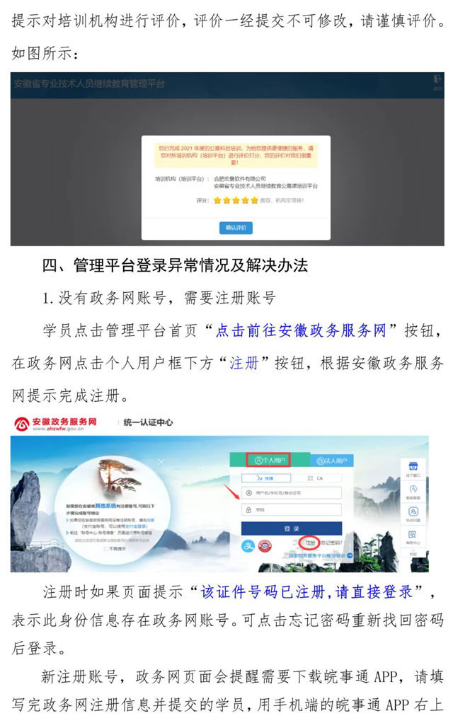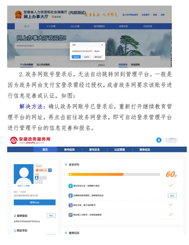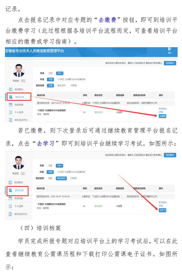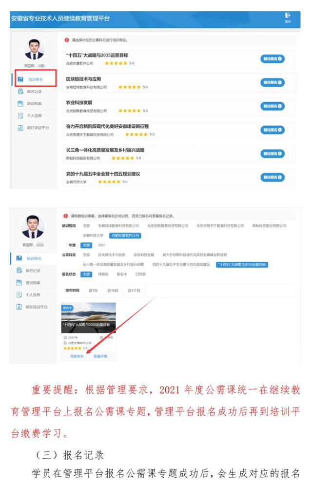 2021年度公需科目培训网上报名已经开始。请职工按照要求缴费报名尽快学习。公需科目培训成绩作用于东方医院集团每年聘用参照材料及每年职称考试报名的参照材料。一、培训内容:根据皖人社秘〔2021〕115号文件规定,2021年度我市继续教育公需科目确定为:《“十四五”大战略与2035远景目标》、《长三角一体化高质量发展及乡村振兴战略》、《党的十九届五中全会暨十四五规划建议》、《农业科技发展》、《区块链技术与应用》、《奋力开启新阶段现代化美好安徽建设新征程》。专业技术人员可任选其中1个专题学满30学时,即可认定完成当年的公需科目学习。二、培训方式:2021年,全市专业技术人员继续教育公需科目采取网络在线学习。专业技术人员登录安徽省人力资源和社会保障厅官网,进入“在线办事”栏(或直接打开网址http://hrss.ah.gov.cn/ggfwwt/),由“继续教育官方入口”登录并注册学习。登录注册前,学员操作指南、常见问题解答,可自行下载学习。专业技术人员完成公需科目学习后,须参加考试,成绩合格者可打印合格证书。