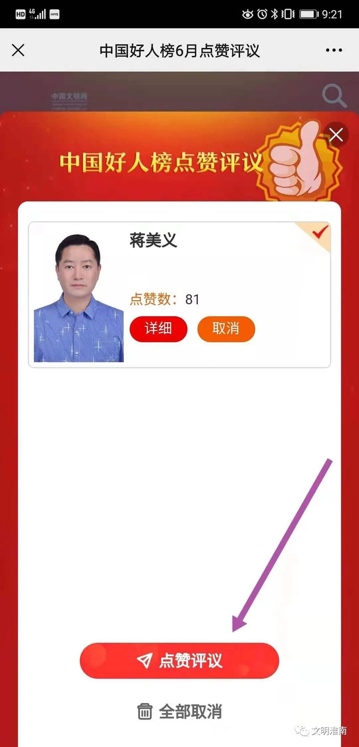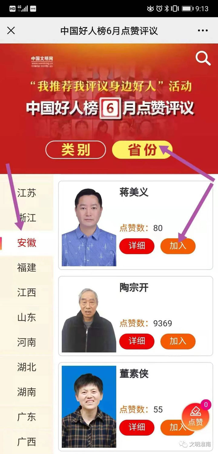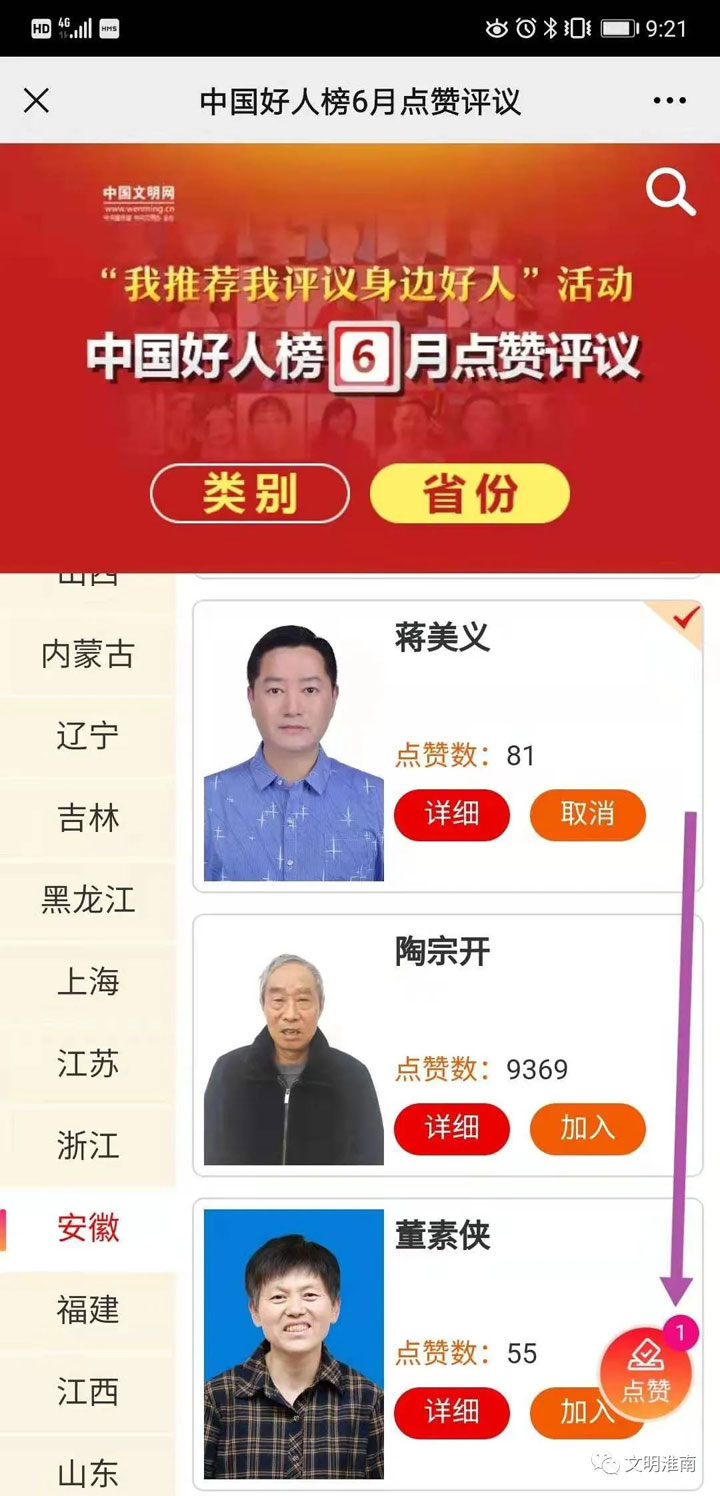 中央文明办依托中国文明网开展网上“我推荐我评议身边好人”活动,定期发布“中国好人榜”,旨在发现身边的凡人善举。经各地文明办筛选、审核、推荐,本月共推出251位候选人,并在网上公示,接受网友点赞评议。从即日起至月末,网友可通过搜索关注“中国文明网”、“凡事不凡”两个微信公众号,通过菜单栏进入点赞页面,每位网友对每位候选人当月只能点赞一次。让我们动动手指,为淮南候选人蒋美义点赞吧!