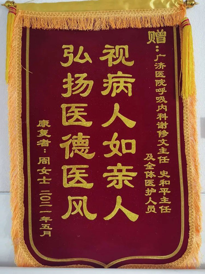 真诚是赢得信任的基础。家住新家园的邹阿姨(化名)近来因为咳嗽、咳黄脓痰一周、伴右侧季肋区持续性隐痛就诊于广济医院呼吸内科。门诊行胸部CT检查,提示:右肺上叶及中叶炎症、右肺门增大、右肺上叶支气管栓,诊断为“社区获得性肺炎”。起初为了邹阿姨能够兼顾家庭,史主任给予口服药物治疗方案。用药后邹阿姨隐痛症状得到缓解,由于病灶面积较大,痰栓考虑会不会有新生物,不排除有肿瘤可能,细心的史主任建议其住院行进一步治疗。在谢修文主任和史和平副主任为其制定的全程规范抗感染、化痰平喘治疗后,邹阿姨复查CT提示病灶完全吸收。康复出院之际,邹阿姨开心的送上“视病人为亲人 弘扬医德医风”的锦旗。