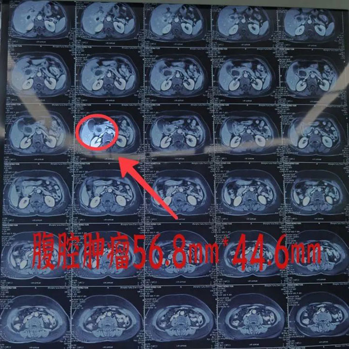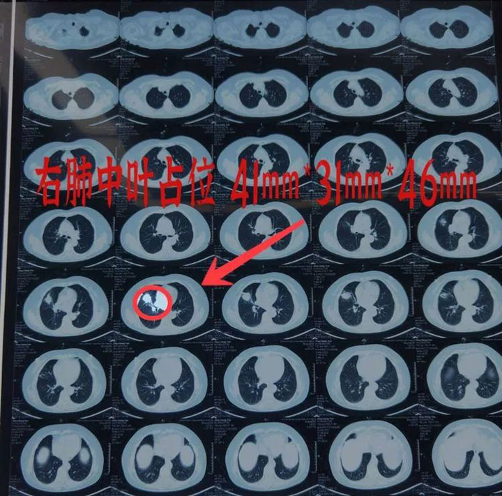 家住谢家集区的张女士,两月前因季肋区疼痛,就诊外院,CT提示右肺叶占位性病变。为进一步治疗,家人携张女士多次往返于上海多家医院,PET-CT提示:右肺中叶肺癌、侵犯右肺上叶,免疫组化考虑低分化腺癌,肺穿刺活检提示:低分化肺腺癌。腹部肿块穿刺,见腺癌细胞。