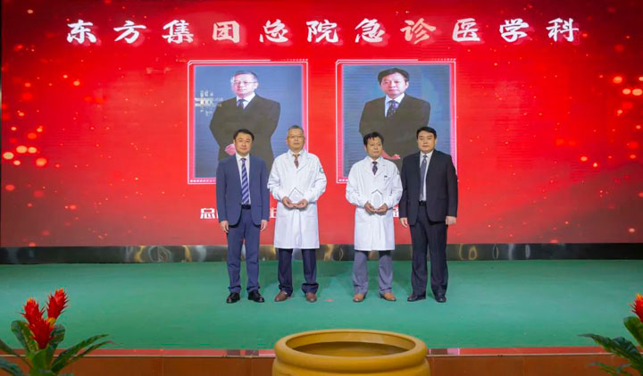 集团领导为东方医院集团总院急诊医学科行政主任赵磊、总院副主任杜明桥颁发聘任奖杯。