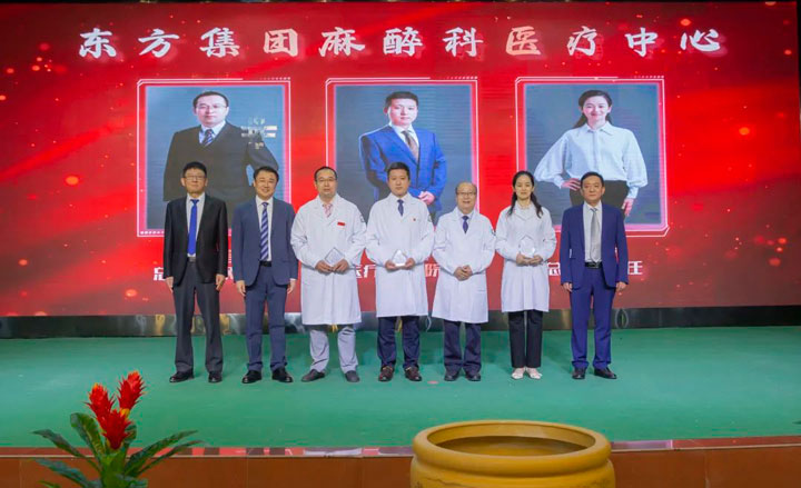 集团领导为东方医院集团麻醉科医疗中心院长刘仑、总院行政主任徐宗雪、总院副主任薛玲颁发聘任奖杯。