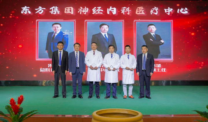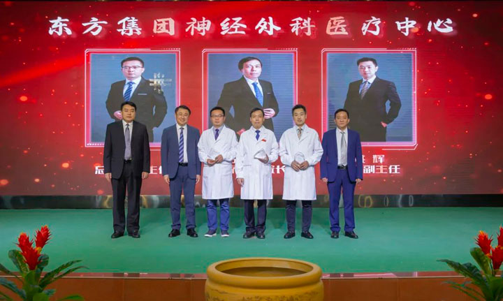 集团领导为东方医院集团神经外科医疗中心院长张德辉、总院行政主任吴鹏、总院副主任姚晖颁发聘任奖杯。