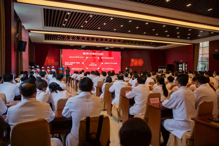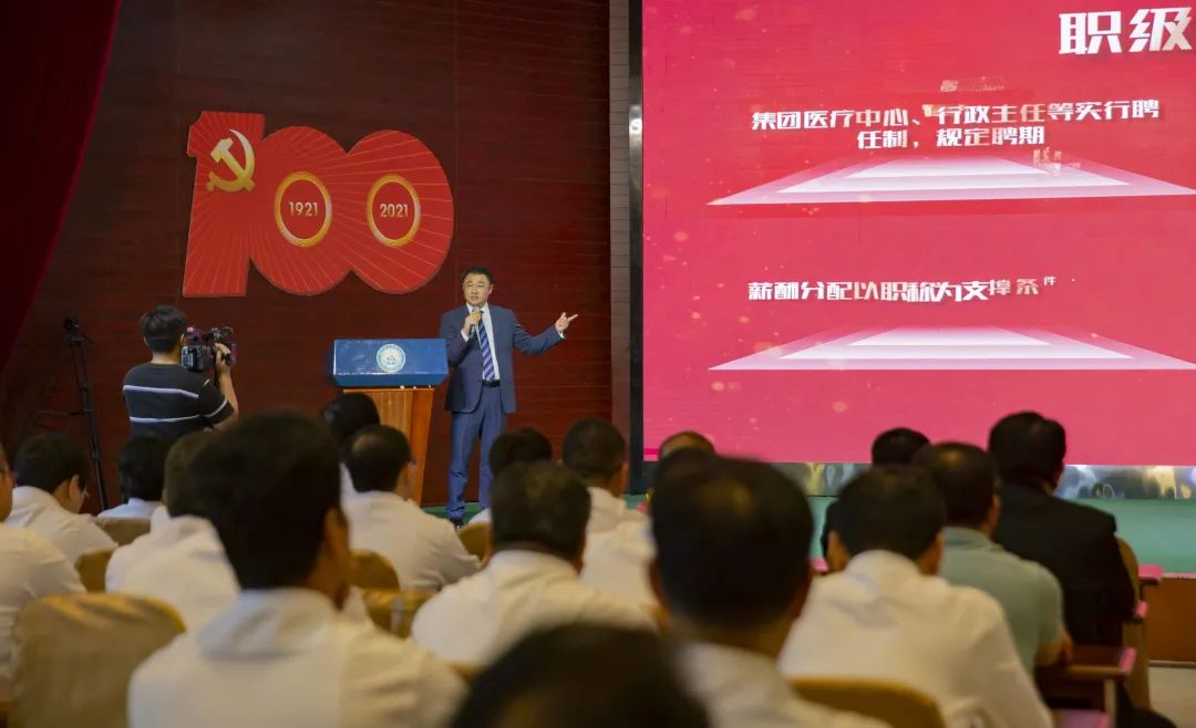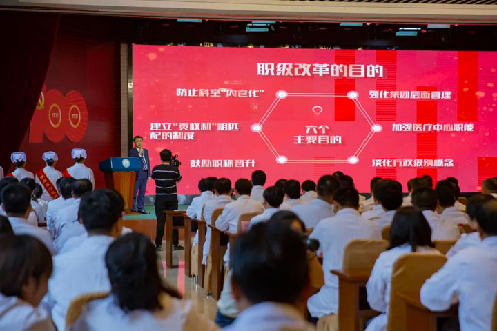 董事长指出,此次职级改革有六个主要目的:一是防止科室“内卷”化。目前,许多科室,尤其是一些大的科室由于主任较多,客观上造成了“一个和尚挑水吃,两个和尚抬水吃,三个和尚没水吃”的被动局面。职级改革通过催生内动力,可以有效地化解这个难题。二是管理架构由总院管理制向集团制管理转变。三是进一步加强医疗中心职能。董事长指出,医疗中心架构是集团率先开展的一项改革。它是在集团由30多家医院撤并为“五大六小”医院,在业务、人才梯队、医疗安全、医院管理等方面难度加大,亟需一个有效通道打通各个管理环节的背景下应运而生的。通过近几年的不断拓展,取得了显著成效。但随着中心制的不断健全和完善,医疗中心自身也要加强内部管理。只有中心职能加强了,行政职数才能降低,才能真正将有限的资源向临床一线倾斜。四是淡化行政级别概念。董事长强调,医生是一个治病救人的职业,行政级别对医生来说没有任何意义。职级改革将废除县级、副县级、科级、副科级等行政级别,转而建立以职称为导向,以职称论待遇,以职称论地位的新发展格局。今后,集团还将逐步把教学、科研、学历等能够体现医生综合能力的要素陆续纳入职级改革,在医务人员中形成以取得高学历、获得高职称,开展新技术、新科研,培养出优秀人才为荣的积极进取氛围,“你追我赶”,不断激发出原生动力。五是鼓励职称晋升。职称作为对医务人员能力、水平、经验的一种认可,只有当所有人素质提高,修为提高,能力提高时,整个集团的发展才能得到显著提升。六是建立起与“责权利”相匹配的制度。集团将对任命的中心主任、科主任、副主任建立一套评价体系,每年度围绕医疗安全、人才梯队培养、科室运营情况等指标进行综合考评。考评以100分为总分值,完成多少分,年底就享受与分值相对应的一次性奖励,从而形成有效的与“责权利”相匹配的分配机制。