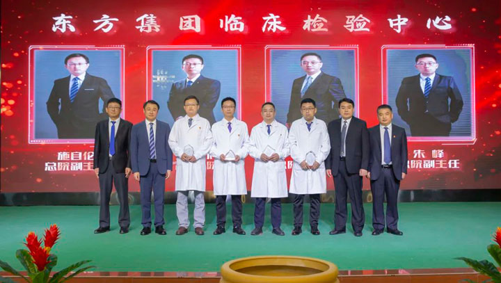 集团领导为东方医院集团临床检验中心院长张志苏、总院行政主任张世武、总院副主任施自伦、总院副主任朱峰颁发聘任奖杯。