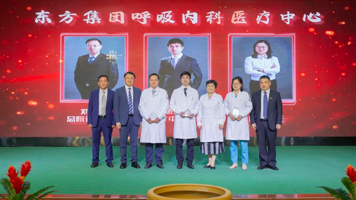集团领导为东方医院集团呼吸内科医疗中心院长杨传留、总院行政主任刘靖丰、总院副主任倪荣萍颁发聘任奖杯。