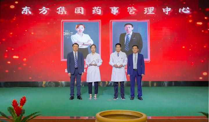 集团领导为东方医院集团药事管理中心院长饶静、总院行政主任金晓国颁发聘任奖杯。