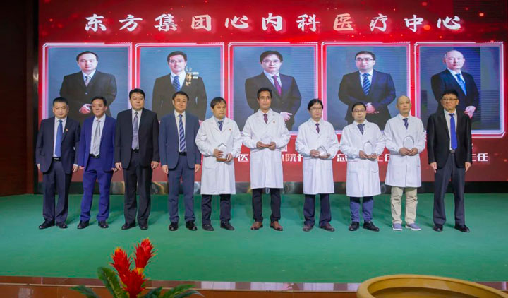 集团领导为东方医院集团心内科医疗中心院长李枫、总院行政主任汪蛟龙、总院副主任王其虎、总院副主任刘焰华、总院副主任叶平颁发聘任奖杯。