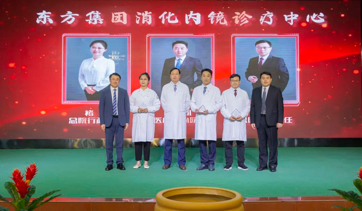 集团领导为东方医院集团消化内镜诊疗中心院长吴凯、总院行政主任褚源、总院副主任王佐颁发聘任奖杯。