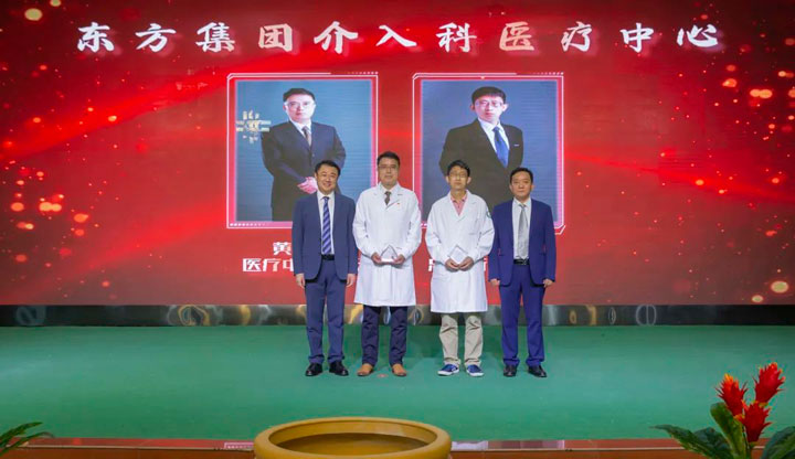 集团领导为东方医院集团介入放射科医疗中心院长黄旭东、总院行政主任张均维颁发聘任奖杯。