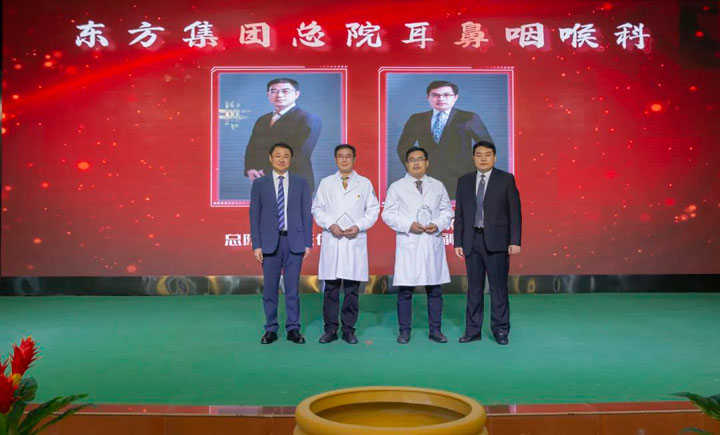 集团领导为东方医院集团总院耳鼻喉科行政主任蔡克万、总院副主任王政林颁发聘任奖杯。