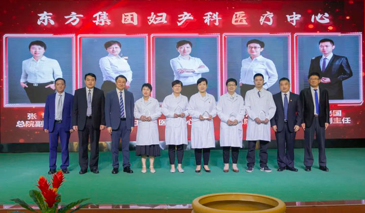 集团领导为东方医院集团妇产科医疗中心院长苏璿、总院行政主任郑晓燚、总院副主任张艳、总院副主任汪云、总院副主任徐光国颁发聘任奖杯。