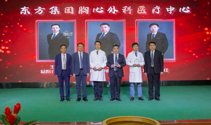 集团领导为东方医院集团胸心外科医疗中心院长朱胜、总院行政主任王鸿、总院副主任随志辉颁发聘任奖杯。