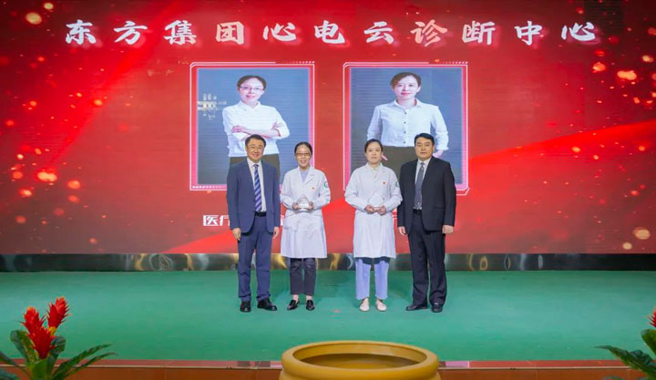 集团领导为东方医院集团心电云诊断中心,院长冯湘红、总院行政主任江辉颁发聘任奖杯。