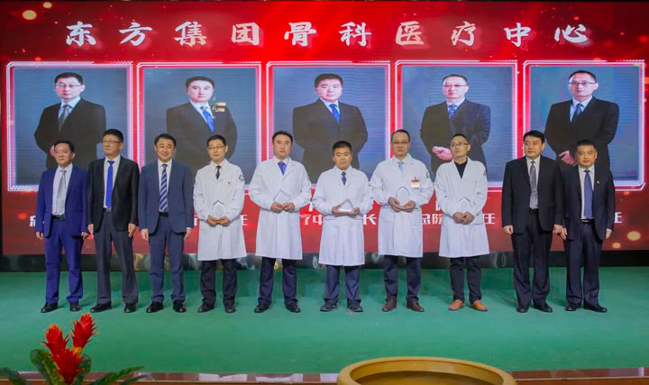 集团领导为东方医院集团骨科医疗中心院长方成、总院行政主任江涛、总院副主任李清、总院副主任陶勇、总院副主任柏文昆颁发聘任奖杯。