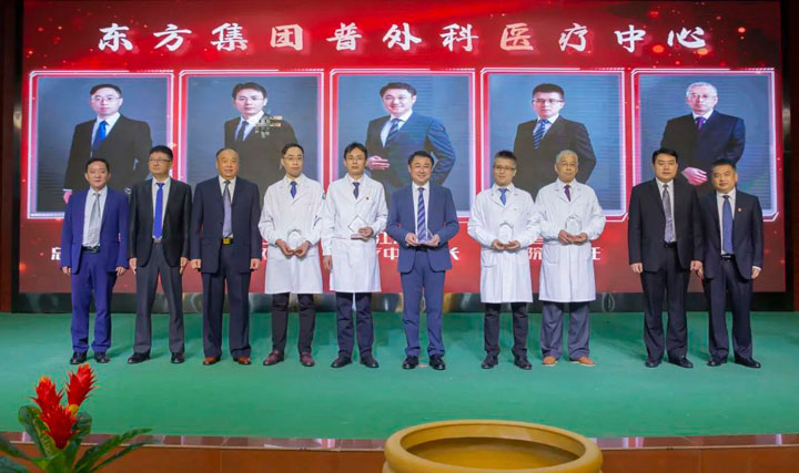 集团领导为东方医院集团外科医疗中心院长江永强、总院行政主任孟云、总院副主任曹辉、总院副主任张军、总院副主任耿道国颁发聘任奖杯。