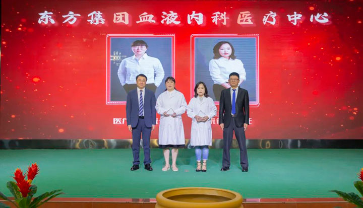 集团领导为东方医院集团血液内科医疗中心院长程家凤、总院行政主任王晓培颁发聘任奖杯。