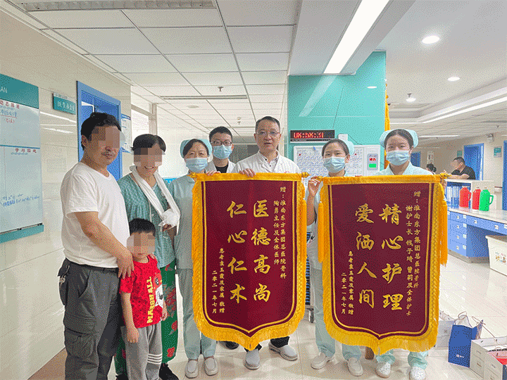 为了表达对骨科专家及团队的感激,袁女士出院时特地定制了两面锦旗献给他们。一面写着“医德高尚·仁心仁术”,一面写着“精心护理·爱洒人间”。“要不是遇到陶主任出手相救,要不是医生护士们对我尽职尽责地治疗关爱,很难想象我手伤成那样还能保得住!我会一辈子记得他们的好!”