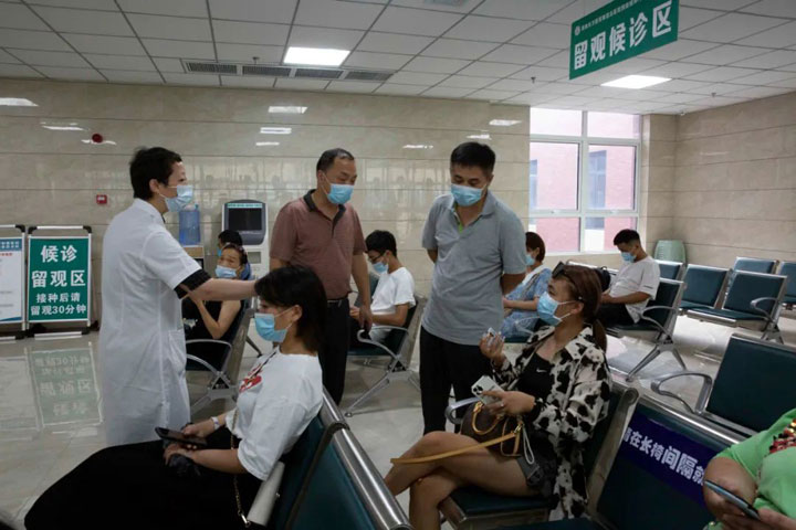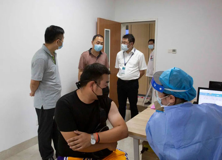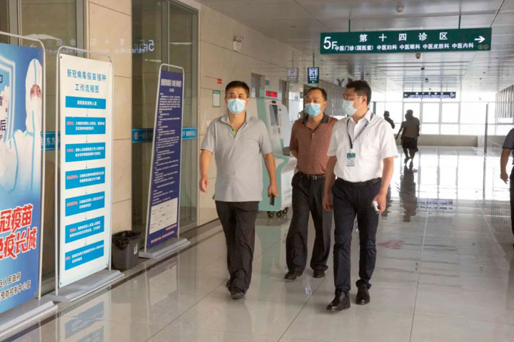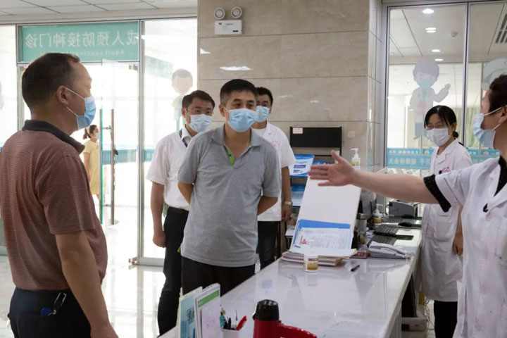 王处长一行扫码、测温进入门诊大楼,查看了等候区、登记区、接种区、留观区等,并按照接种流程逐一巡查各环节工作,询问留观人员是否清楚疫苗注射后的注意事项等。在认真听取江永强董事长关于疫情防控工作及疫苗接种工作进展情况汇报后,对东方总院门诊预防接种的工作给予了充分肯定。