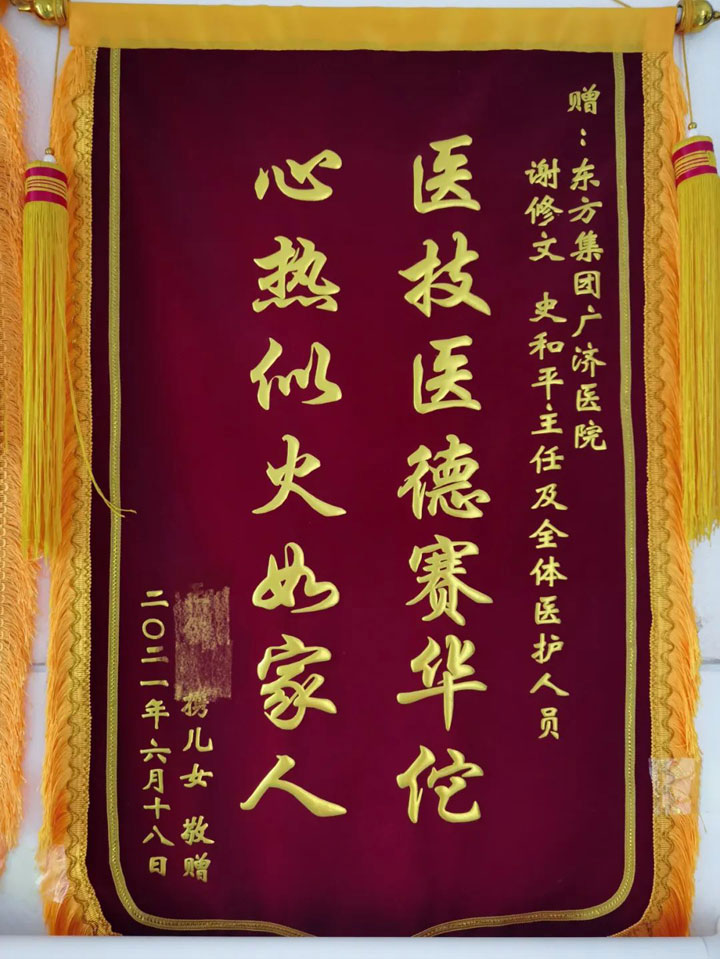 窗外不知什么时候已经亮起了路灯,看到病床上的呼吸平稳的父亲,和还在忙碌的医护人员,病房中汪老的女儿含着泪在朋友圈写下了这样一段话:“老爸,一名普通的共产党员……2000年在东方总院行右肺肿瘤切除术,在漫长的21年中,坚强的与病魔斗争。6月12日突发窒息,由寿县济民医院急转东方肿瘤医院,路途中联系徐从景院长,徐院长立即从家中赶至呼吸科,果断在病房内(为老爸)行纤支镜诊疗,术后一直昏迷不醒,家人一度放弃。后转至广济医院呼吸科,谢修文主任、史和平主任带领医护人员积极抢救,到了夜间史和平主任依然坚守在病房。21年来,老爸历经无数次生死,感谢所有东方人的不放弃!也祈祷老爸早日康复!”后来,老人生命奇迹延续,短短的十天里从生命垂危到迅速康复,顺利出院。出院之后,汪老的家属送来锦旗,忍不住流下了感动的泪水。