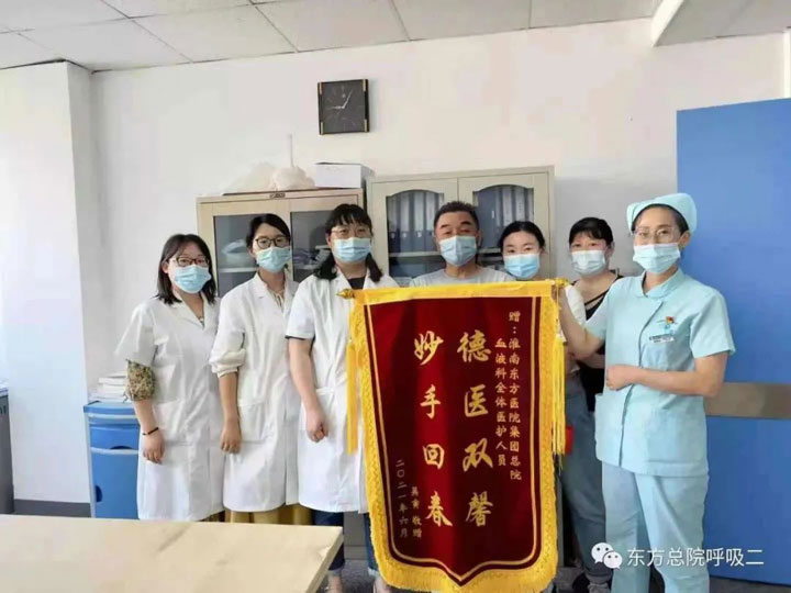 医护人员对躺在层流床上的吴先生予以抗感染等治疗,白细胞立刻增多,身体指标转好,期间医护人员时时予以关心和照顾。可刚有好转,另一个烦恼又来了。原来,吴先生病房里同住着一位80岁的老奶奶,家住农村得了肿瘤,身体耐受力差,坚持不让开空调,炎炎夏日吴先生苦不堪言又无以言说……医护人员马上对吴先生进行劝慰,在治疗逾3天其白细胞恢复后,将其调转住进其他病房,问题迎刃而解。7天后,吴先生恢复出院,他和家人感激不过,特意定了一面锦旗,郑重送到总院血液科。“德医双馨·妙手回春”的赞语是对医护人员医术医德的高度肯定,同时感谢他们对患者反映问题给予及时周到的处理和细心耐心的解释。