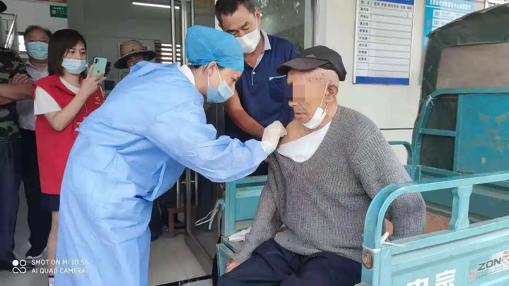 2021年8月23日,李郢孜医院疫苗接种小组变身“游击队”走进李郢孜镇北梨园村委会,在这里,遇到了一位特殊的老人,这位尹大爷今年107岁,身体健朗,听说医院在村委会给老人们打疫苗,他便让子女给他送来,尹大爷因早年被大火烧过 导致口齿不清,他的子女转述说:“老爷子天天看新闻里都在打针,嚷着也要打疫苗,说是要配合国家政策、不添麻烦,一直没带他去打疫苗是因为医院天天排队人太多 ,我自己打针都排了两三个小时队,天气这么热他这么大年纪根本受不了长时间排队,今天知道你们上门来,我赶紧给他带来了,感谢你们,你们真是为老百姓办实事,谢谢谢谢”。在话语间,尹大爷一直笑着,从尹大爷的神情可以读出,他能在家门口打疫苗他真的很开心。