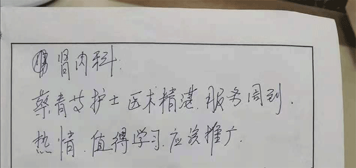 说到肾内科,很多人都知道,慢性肾脏病病人多数都有肾性高血压,这也就意味着科室护士,特别是责任护士,每天需要对病人进行多次血压测量。可肾病学科有很大一部分是血液透析患者,大都有动静脉瘘,而瘘测手臂是不能进行测量血压、静脉输液、静脉采血等护理操作的。也就是说,使用内瘘透析的患者只有一侧手臂可以进行护理治疗,如果瘘侧手臂先输液,患者便不能及时监测血压。为了保证每个病人都能及时测量到血压,蔡护士每天早早地来到科室,换上工作服后便开始为患者测量血压,病人们看在眼里记在心里,因为此事科室病人对蔡护士一致好评,今年4月20日,一名83岁的老病人,更是出院时不忘在病患意见薄上提名表扬蔡护士。