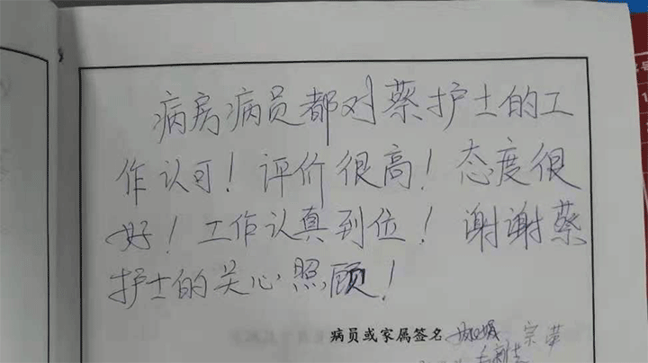 “金杯银杯不如百姓口碑”,每一段留言都藏着一段感动人心的故事,每一个故事都是蔡护士用心践行优质护理服务理念结出的果实。像这样的事,蔡护士经历过很多次,每一位病人的感谢对蔡护士而言,不仅是沉甸甸的一份荣誉,更是她工作不断进步的动力。