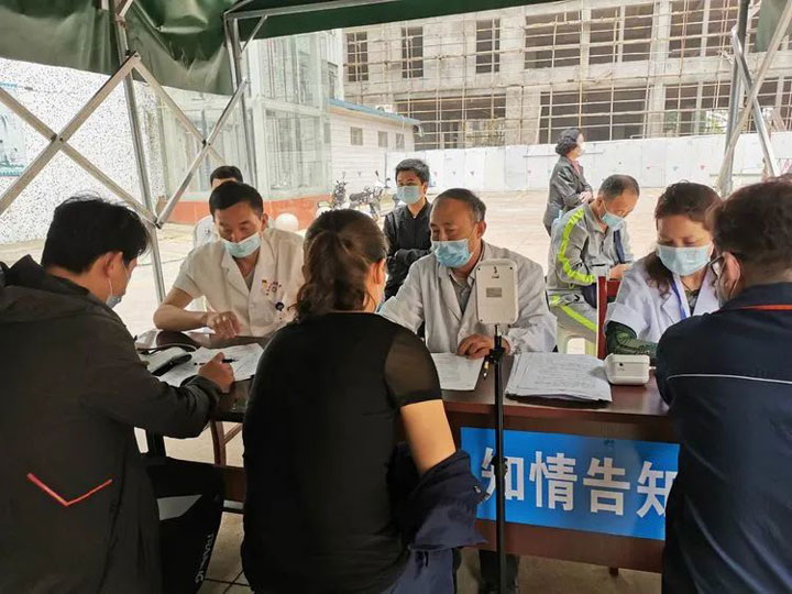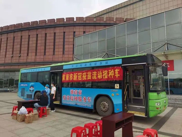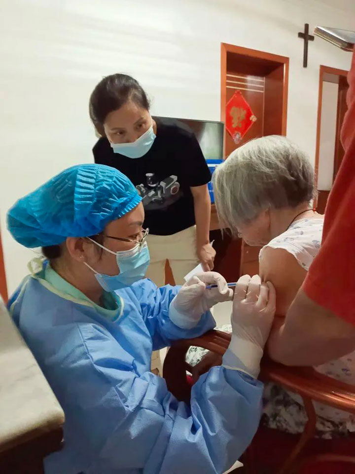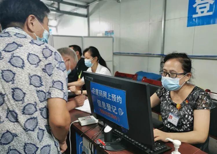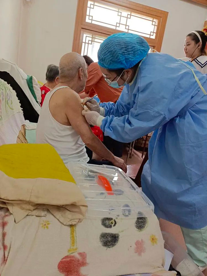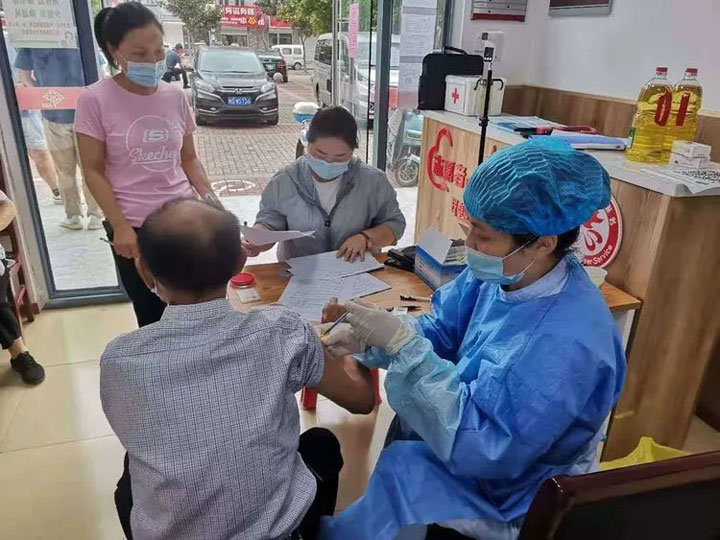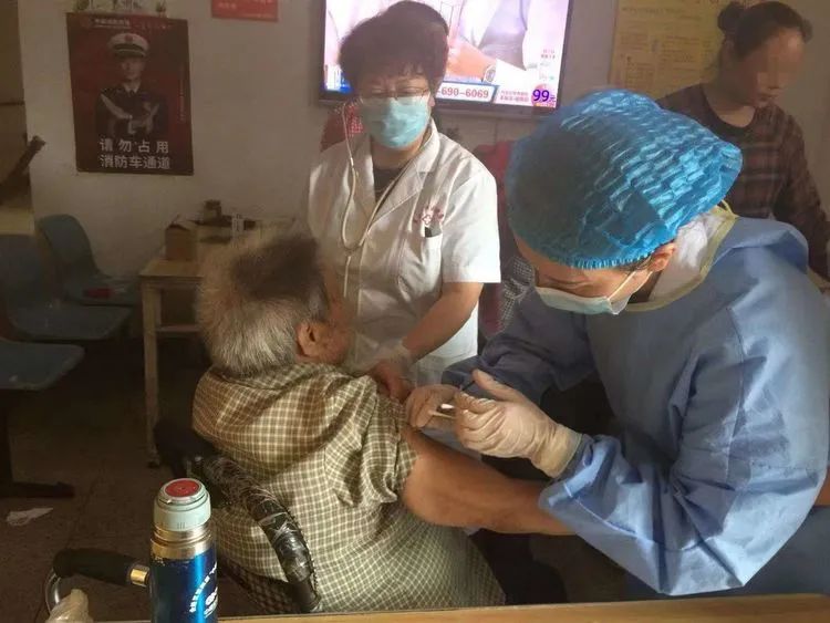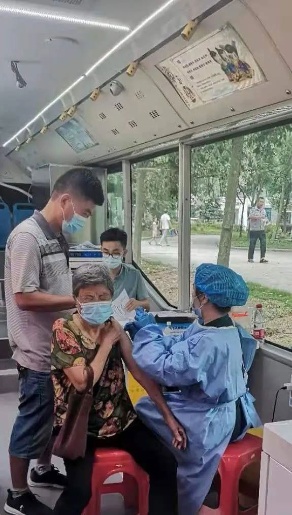 退休返聘年已6旬上下的汲长丽、刘家春两位党员主治医师也分别奔波在入户接种和流动接种车上。