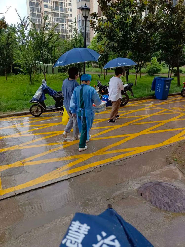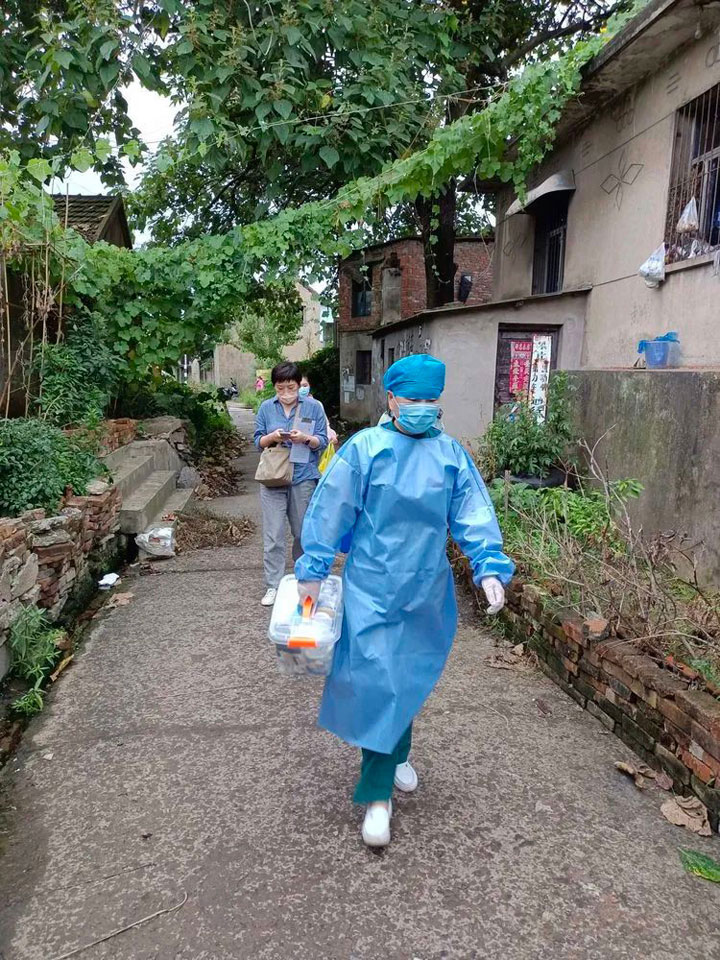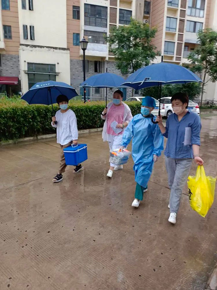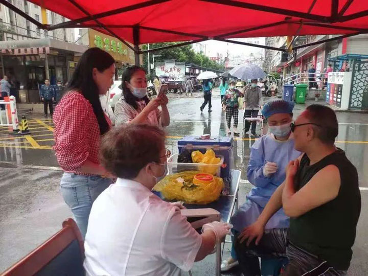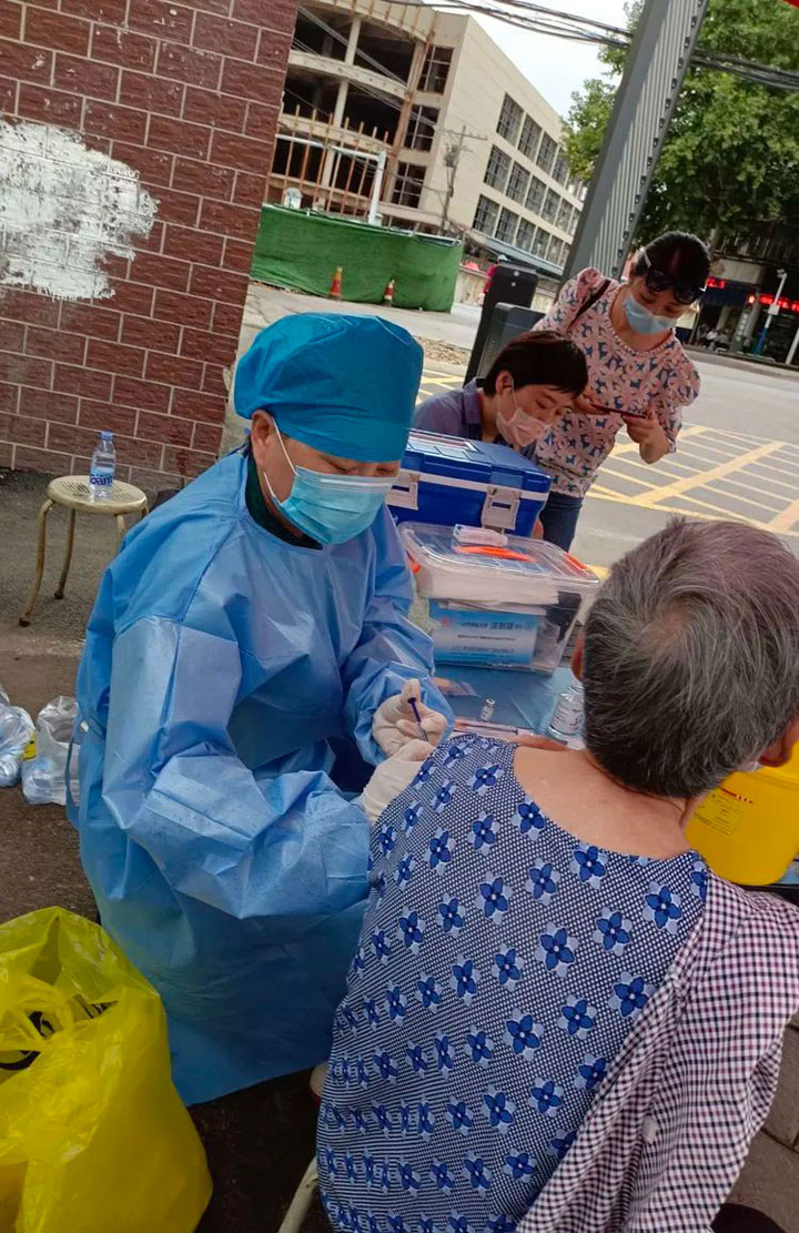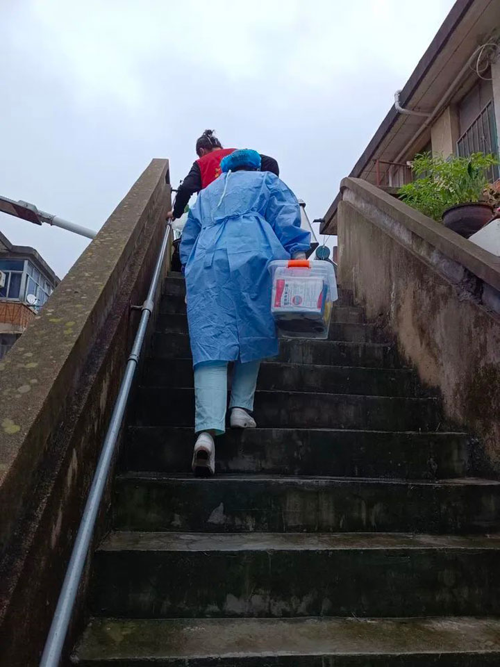 8月27日这天一早,3组人员外出接种,入户125户,汲长丽医生、顾艳护士长这组创纪录全天入户66户,不停地上楼下楼,脚磨出了泡,腿也快跑断了,她们毫无怨言。