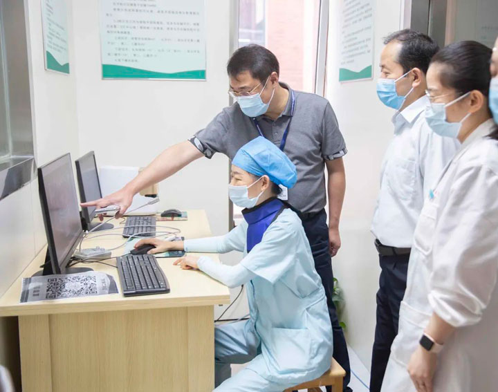 接着李校长一行来到集团云影像中心,现代化的云影像技术给各位领导留下了深刻印象。患者在家门口的基层医院做检查时,技术人员通过信息网络及远程读片诊断系统将患者病例数据、影像数据传到云端,由集团专家完成诊断、出具报告,秒传回基层医院。速度快、能力强、效率高,东方医院集团通过整合医疗资源,实现医疗资源共享,使集团整体服务能力实现质的飞跃。