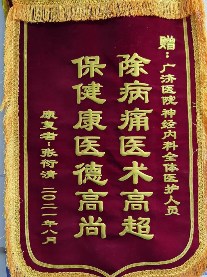 经过积极的治疗,邱老师症状好转,视野缺损也得到改善。康复出院之后,给科室送来一面锦旗:“除病痛医术高超,保健康医德高尚”。