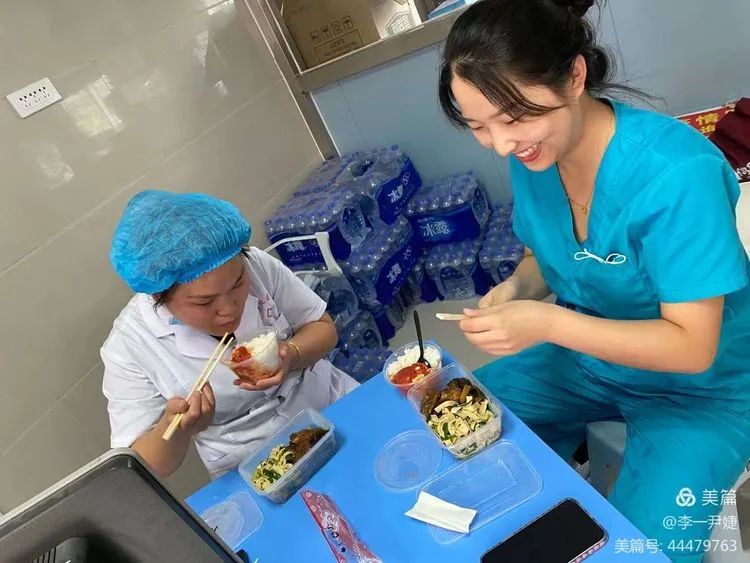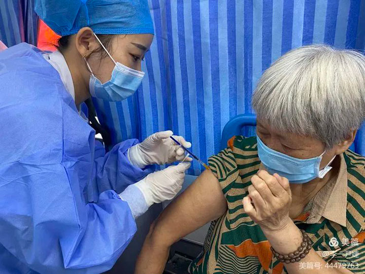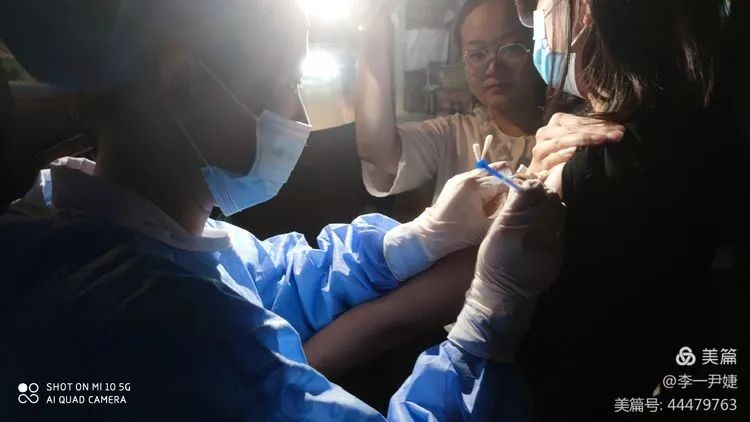 由于接种点空间有限、工作节奏加快,医务人员把握点滴间歇时间,手端盒饭轮班用餐,有时接种工作要持续到夜里九点以后,大家没有一句怨言。反而非常积极乐观。