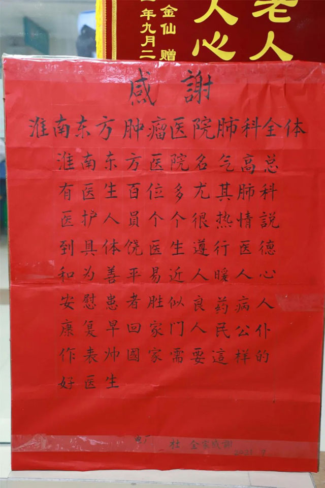 10月18日,出院半年的老人又在老伴陪同下回院复查。这次住院,老俩口特意带来早已准备好的锦旗和感谢信专程送到医生办公室。老人老伴高兴地说:“老头子上次出院后,吃饭也能吃了,面色也红润了,精神头比得病前还足,好多老邻居见了他都说,你水色这么好,哪像是有病的呀!可把老头乐坏了。这都得谢谢这些医生和护士们。这次复查,也是他们主动打来电话询问病情的,服务态度真得没话说。”正是这种亲人般的嘘寒问暖,令老人倍感温暖,他们不仅为管床饶医生送来了锦旗,还专门为肺癌中心全体医护人员写了一封感谢信,似乎只有这样才能彻底表达他们内心的感激。