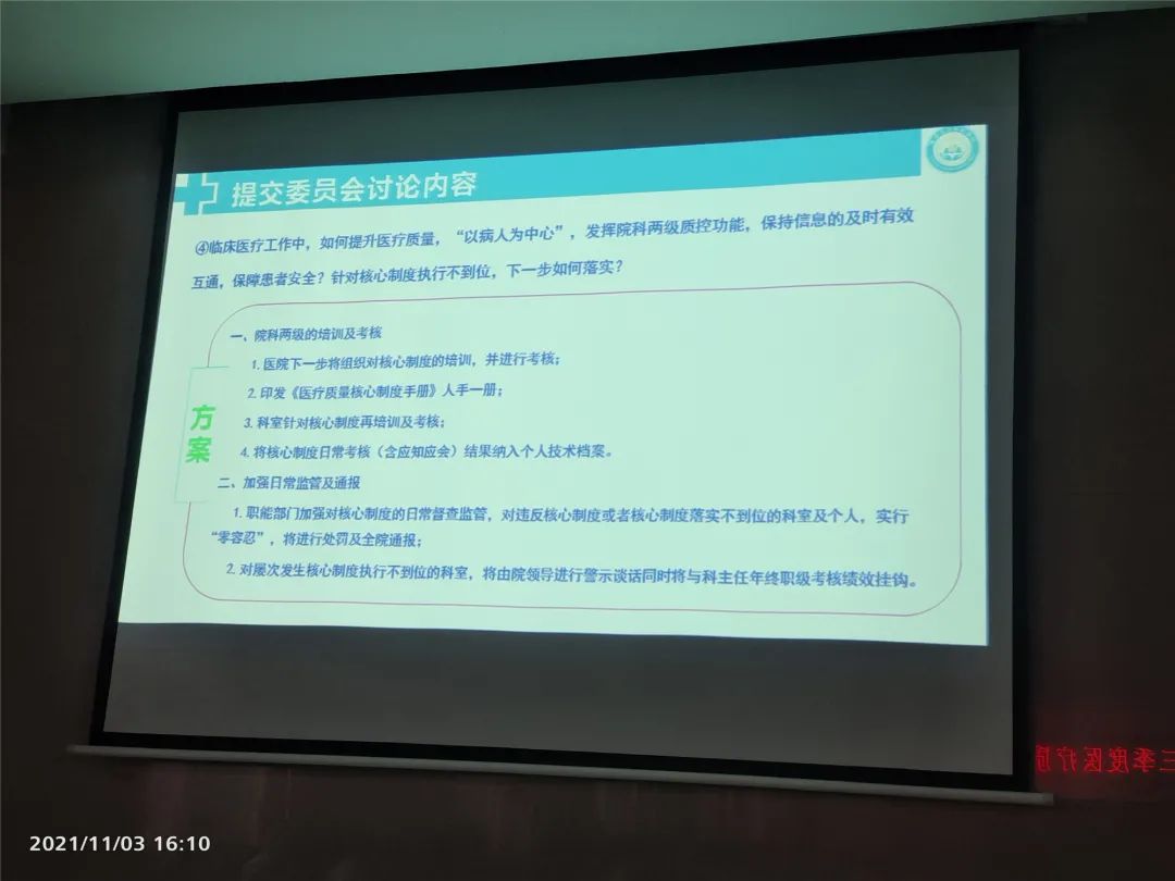 会议经讨论,通过了手术分级授权审批部门由医疗技术管理委员会改成医疗质量与安全管理委员会、(特殊、重、大)手术审批流程增加分管院长意见栏、加大围手术期管理处罚力度(违反医疗文书单否项:丙级单否500元;乙级单否300元;未按要求进行三方核查200元/例)以及进一步加强落实核心制度方案的决议。