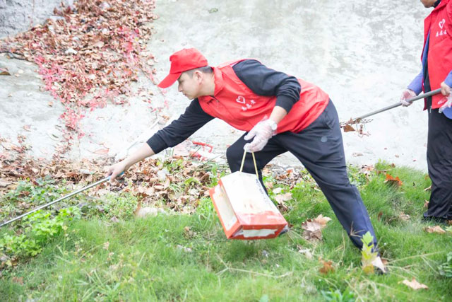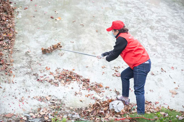 特别是一处水泥坡面上爬有干枯的爬墙虎,影响美观。刘艳华书记率先垂范,站在坡上用耙子将爬墙虎的枝条拢到一边,再徒手将枝条扯断。志愿者们为了能尽可能的将草坪深处的垃圾清理干净,不顾脚陷在淤泥里,草上的雨水将裤子沁湿,积极发挥奉献精神,不怕脏不怕累,积极参与,认真清理垃圾、杂草、淤泥等。虽然天气微凉,但大家干得如火如荼,大汗淋漓。