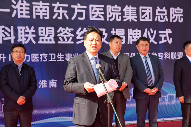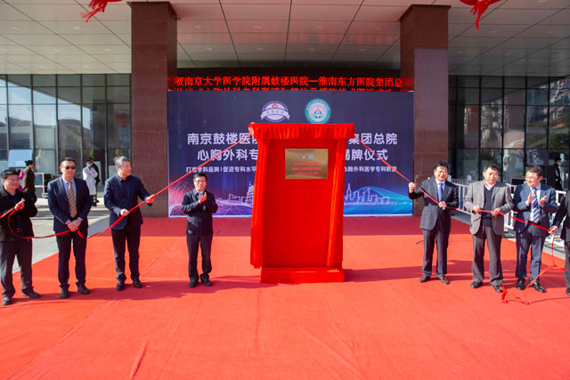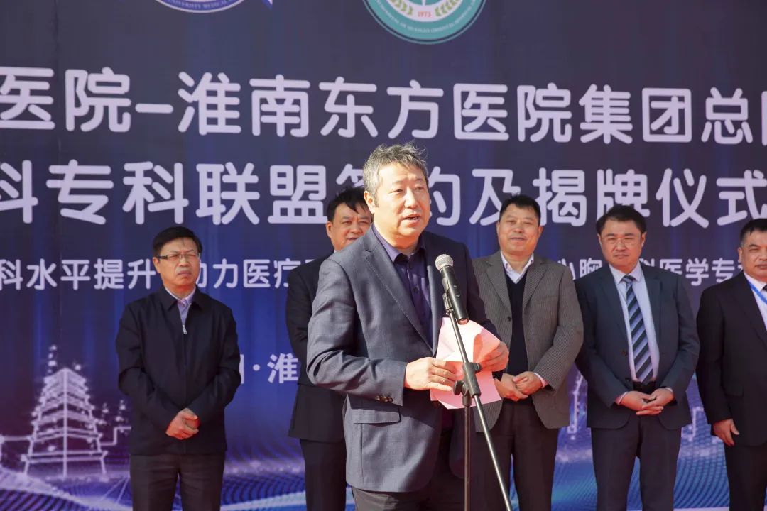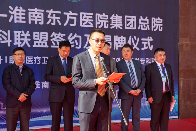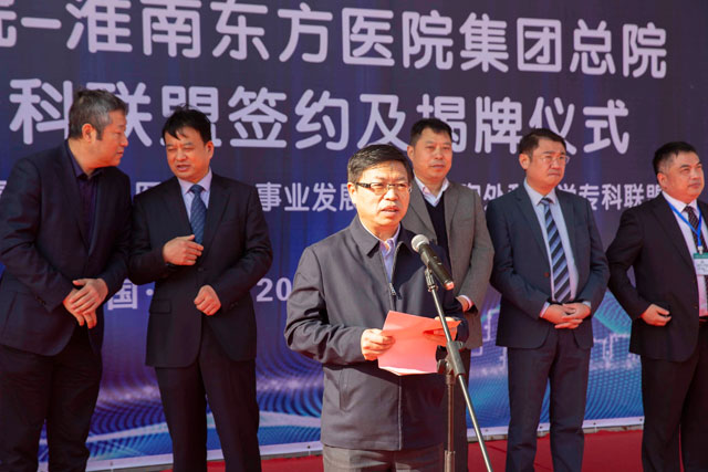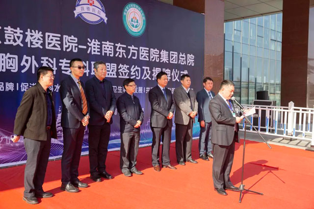 为加快长三角一体化发展,进一步提升淮南地区心胸外科专科诊治水平和服务能力,为本地区患者提供系统、有效和经济的医疗服务,让患者在家门口就能享受大医院专家的服务,南京大学医学院附属鼓楼医院与淮南东方医院集团总医院于2021年11月28日举行共建“心胸外科专科联盟”签约及授牌仪式,南京鼓楼医院副院长于成功、心胸外科主任王东进、鼓楼医院医联体处长王进、心胸外科副主任周庆、安徽理工大学副校长鲁超、淮南卫健委主任汪世福、淮南东方医院集团董事长江永强,总院副院长朱胜等领导出席仪式。