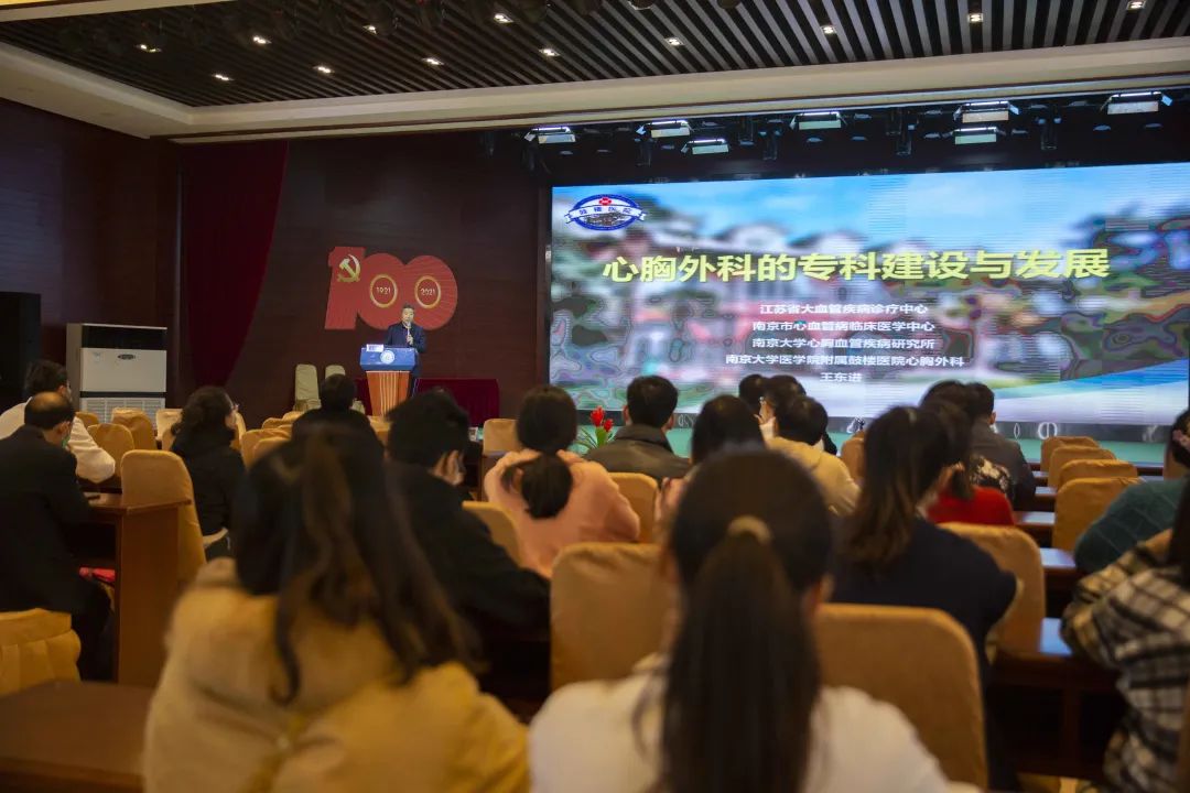 最后两院心内、心外科团队前往东方总院多功能厅开展学术讨论,南京鼓楼医院心胸外科主任王东进教授就《心胸外科的专科建设与发展》进行了授课,分享了先进的科室建设理念并为心血管外科指明了发展的方向。