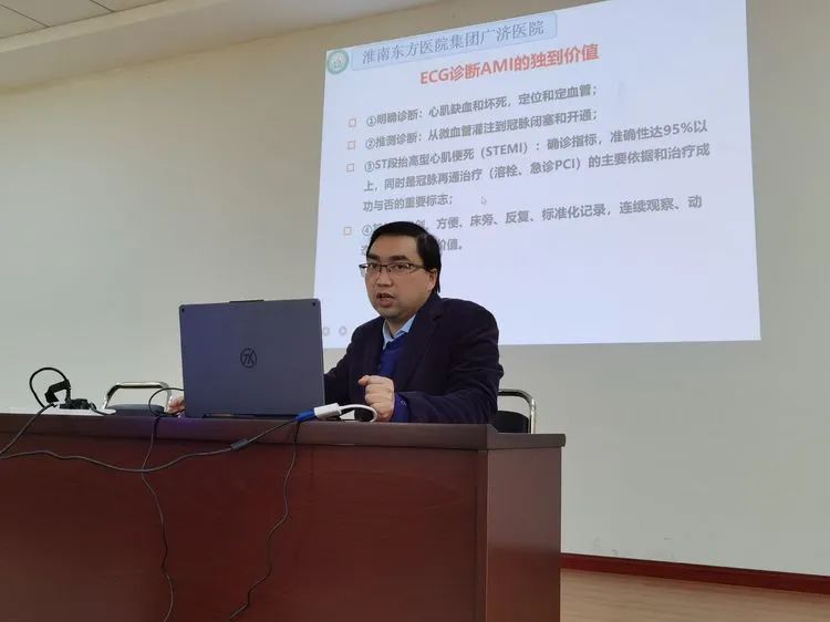 在跟着李院长系统的学习了急性胸痛早期快速甄别需要注重的诊疗思路和流程要点后,围绕“心电图是早期快速识别ACS(急性冠脉综合征)的重要工具”,刘焰华副主任紧接着为大家讲解了《急性高危胸痛疾病的心电图特征》。主攻心脏起搏及心脏电生理导管射频消融介入治疗的刘主任,运用形象的比喻,从急性心肌梗死患者的心电图特有表现入手,对非ST段抬高型心肌梗死、ST段抬高型心肌梗死以及不稳定型心绞痛,以及各类心律失常和房室传导阻滞等疾病的心电图分型、动态演变和不同胸痛发作时期心电图各导联的表现进行了讲解分析。