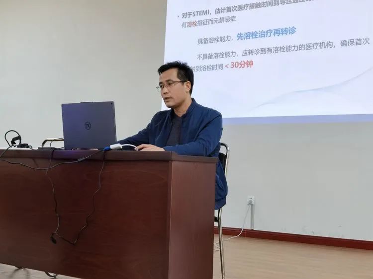 最后,王其虎副主任针对急性胸痛的另一种治疗方式——规范化溶栓,进行了补充讲解。对比不同胸痛患者溶栓治疗与心脏介入治疗的效果,王主任强调了掌握规范化溶栓治疗的重要性,阐述了溶栓治疗的适应症和禁忌症,以及医患沟通交流的规范用语。