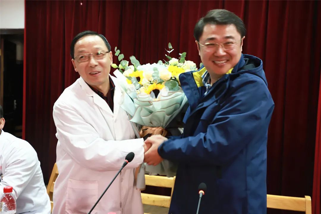 宣读完毕,江永强董事长代表医院集团向李永安院长送上献花,感谢他在肿瘤医院担任院长期间兢兢业业做出的卓越贡献。随后,三位新任领导分别作表态发言。