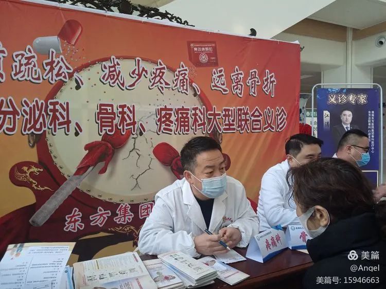 义诊专家是内分泌科安徽省骨代谢和骨矿盐学会的委员,疼痛科是科主任杜建生,在骨质疏松引起的压缩性骨折有一套绝活防治疼痛,骨科是东方医院集团骨科医疗中心的行政主任江涛主任,他在各种骨病,骨代谢骨折,关节镜方面造诣很深。义诊专家们耐心询问患者病史,查体,开具治疗方案!