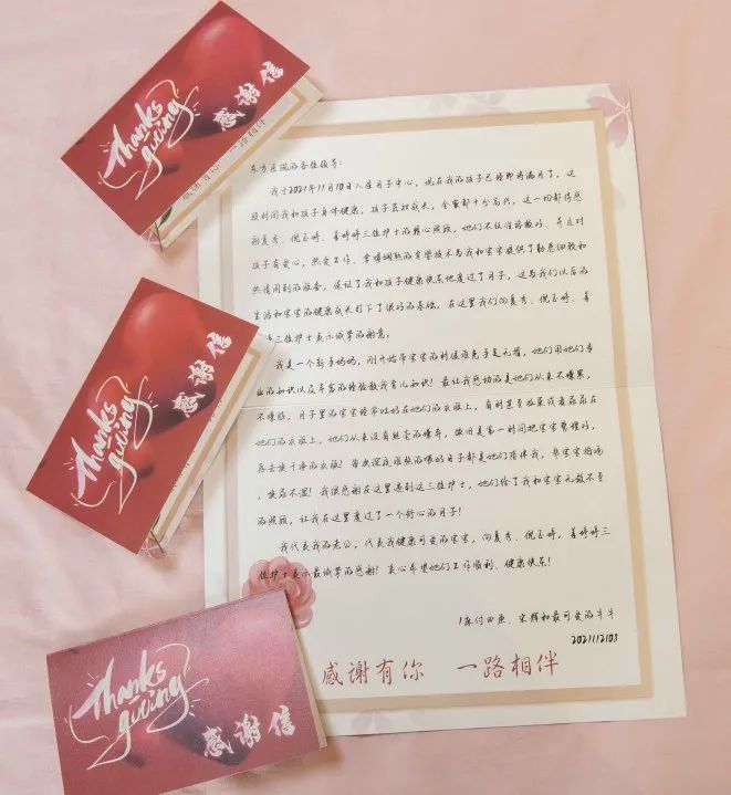 付女士在旭日母子中心的这一个月时间里,对一直悉心照顾她的三名护士,从最初的相对陌生到现在已经变成了无话不谈的好朋友。“有她们在,什么都不用愁,每天做做恢复、吃吃美食、练练瑜伽、学学育儿,让我这个月子坐得很舒心!”付女士说道:“即将离开母子中心很是不舍,希望我们的这封感谢信,能够表达对她们的感谢与认可。”