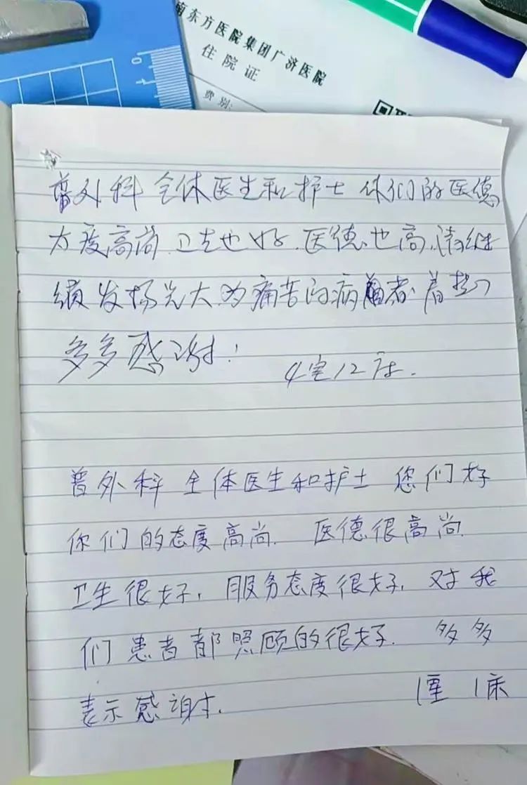 走进广济医院普外科,走廊里是时不时小步快走的白衣天使们,病房中是耐心和患者或家属沟通的医生们,藏在白大褂里的手术衣一闪而过,好像在描述主任们手术台上精彩的故事。办公室内又一位即将康复出院的患者在医患沟通薄上留言:“普外科全体医生和护士,您(你)们好。你们的态度高尚、医德很高尚,卫生很好,服务态度很好,对我们患者都照顾的很好,多多表示感谢。——1室1床”。留言的上方正巧是另一位患者手写的感谢。