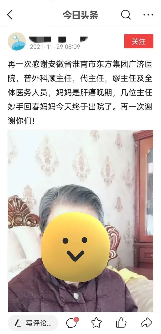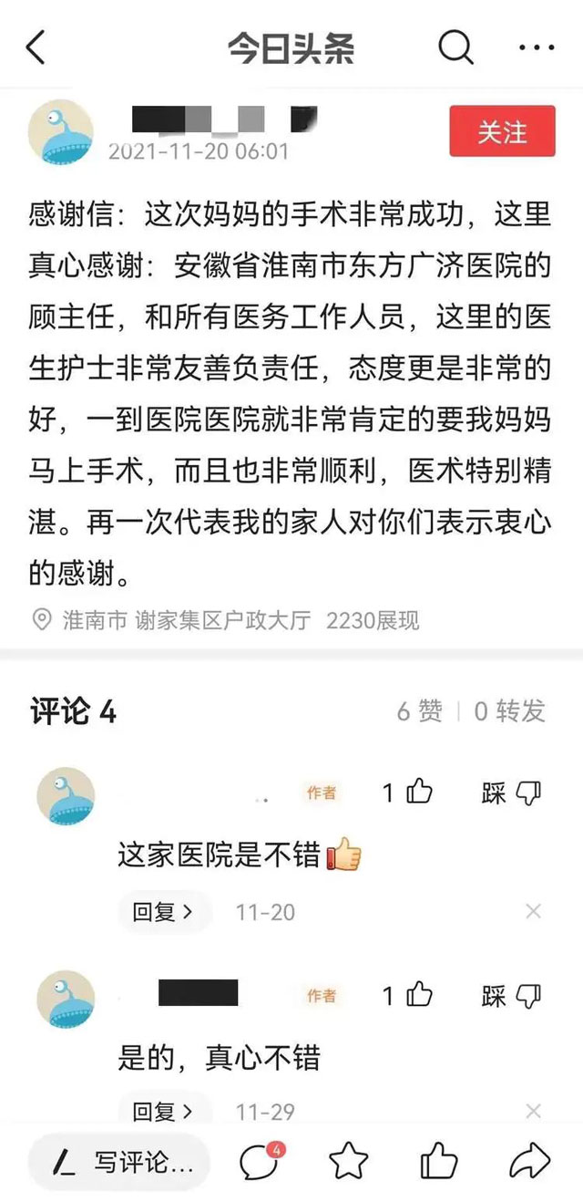 “这次妈妈的手术非常成功,这里真心感谢:安徽省淮南市东方广济医院的顾主任和所有医务工作者,这里的医生护士非常友善负责任,态度更是非常的好......医术特别精湛,再一次代表我的家人对你们表示衷心的感谢。”寥寥数语,道不尽存在心底的暖意。