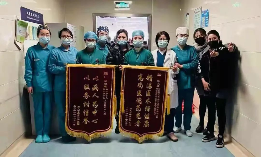 2天后,曹某顺利转入肾内科病房继续治疗。为表感激,曹某的家人专门定制了两面锦旗,送给医生组的锦旗上赫然写着“精湛医术保健康•高尚医德为患者”,送给护理组的写有“以病人为中心•以服务树信誉”!两面锦旗,恰似两片云霞,映出医患双方会心的笑和大家对患者的祝福。