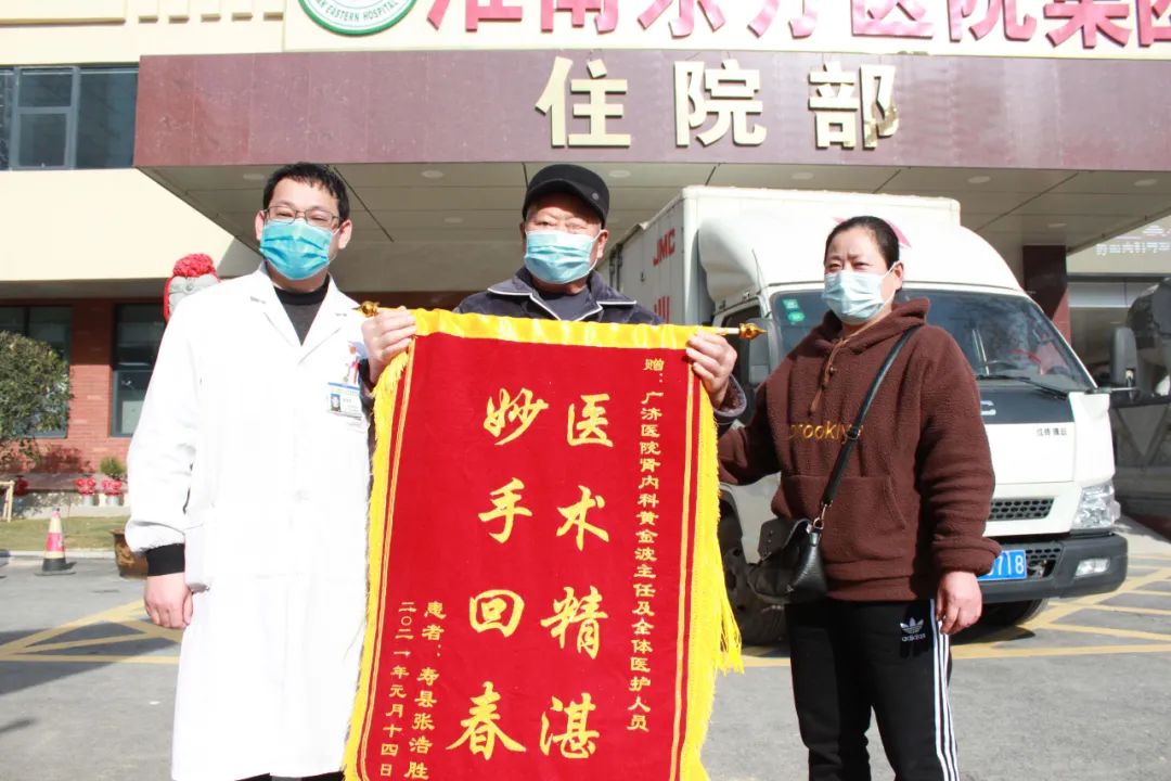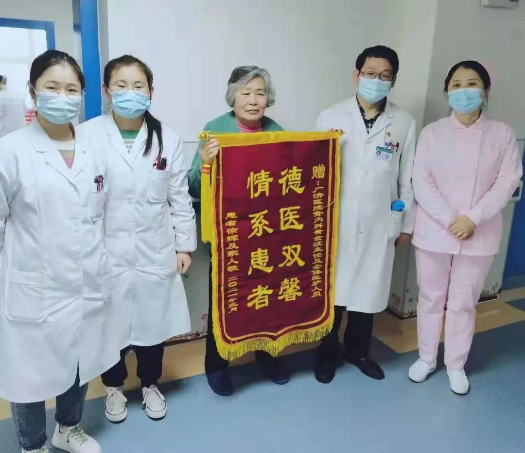 “我老伴吧,从前就在东方总院透析,那时候就是黄主任给看的病,特别细心、特别负责任。广济医院离家近,我和老伴便选择回来透析治疗。后来新广济医院开诊黄主任来了,我们心里更踏实了!一见面,就像碰到多年的老朋友,特别亲切。”王老爷子老伴说:“老头子身体不好,我们都以为这个春节他熬不过来了,没想到情况又一天天好起来了!这都是黄主任和医生护士们的功劳!不知道怎么感谢他们,孩子们说送面锦旗吧,于是我们就来了……”亲手接过锦旗,黄金波的心里暖暖的,感觉身上增添了力量。